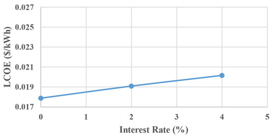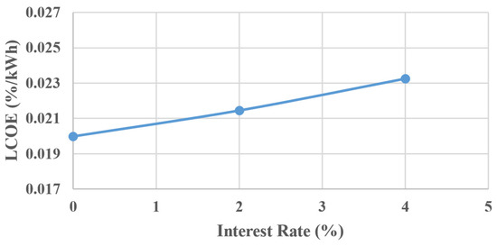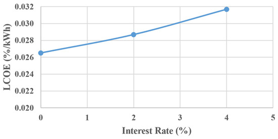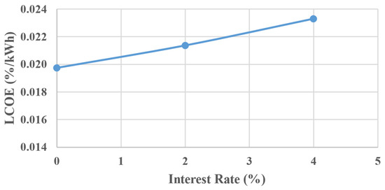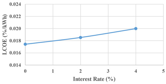 The red curve represents the least favorable scenario, characterized by an initial system efficiency of 0.75 and a degradation rate of 2.5%. Under these conditions, the LCOE increased proportionally with the interest rate. When the interest rate rose from 0% to 2%, LCOE increased by 10.84%, from USD 0.0332/kWh to USD 0.0368/kWh. Further elevating the interest rate to 4% resulted in an additional increase of 16.03% in LCOE, reaching USD 0.0427/kWh. The detailed data for this least favorable case study are presented in Table 6.