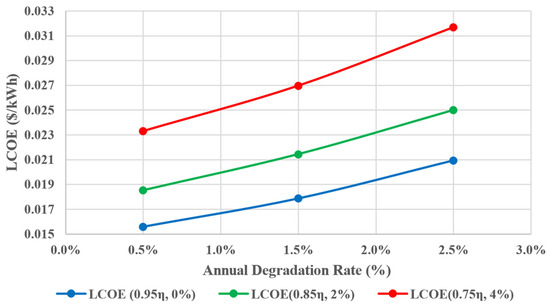 The effect of different PV panel degradation rates (0.5%, 1.5%, and 2.5%) on the LCOE, assuming a fixed initial system efficiency of 0.75 and an interest rate of 4%.