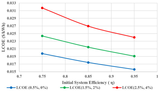 The effect of different initial system efficiencies (0.95, 0.85, and 0.75) on the LCOE, assuming a fixed degradation rate of 2.5% and an interest rate of 4%.