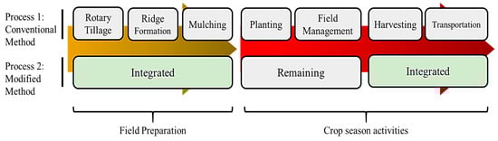 For selecting the appropriate farming steps for integration, the entire farming process was reviewed (Figure 1) according to the general method used to cultivate the most demanded crop in the Republic of Korea, the hot pepper. Taking insights from a previous study, combinations of farming steps were categorized based on their characteristics [31]. Consequently, rotary tillage, ridge formation, and mulching operations were grouped under field preparation and considered operations that could be performed simultaneously using versatile machinery. Conversely, harvesting and transportation were combined as a crop season activity based on the general process of upland field farming, but operated independently using versatile machinery with distinct attachments. Meanwhile, crop planting and field management processes were performed following conventional practices.
