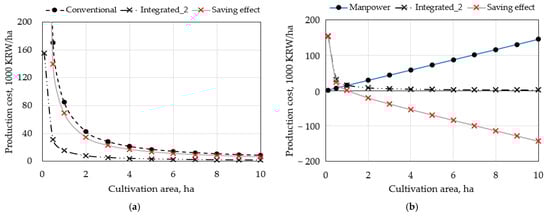 Regarding the expenses incurred for cultivating a single hectare of field crop, Figure 2 presents a comparison of the production costs incurred when using two different agricultural machines versus a single versatile machine for performing harvesting and transportation. Both conventional and integrated methods resulted in decreased production costs, which stabilized for areas exceeding 5 ha. However, using individual machines resulted in higher production costs compared with the Integrated_2 method in all cultivation areas, with the greatest savings effect observed in small-scale farms, especially those below 3 ha. The savings in production costs incurred by the integrated method compared to the conventional method for areas of 0.1, 0.5, 1.0, 2.0, and 3.0 ha were 697,467; 139,366; 69,604; 34,723; and 23,096 thousand KRW, respectively (Figure 2a). Despite the continuing decrease in production costs across all cultivation areas, considering the high proportion of small-scale farms in the Republic of Korea, the impact of using versatile machines will be clearly demonstrated in terms of profitability. The relationship between size and unit cost of the production curve aligned with the hyperbolic form of regression model suggested by Soltani (1976) [64] and the ordinary least square estimators proposed by Debrah and Adanu (2022) [65]. This underscores the need for a revolution in small-scale farming practices, guided by effective management policies aimed at elevating farmer incomes to the next scale. A comparison of production costs incurred by farms using versatile machinery instead of manpower for performing crop season activities revealed farms larger than 2 ha would benefit from using versatile machinery, as the differences between production costs for manpower and Integrated_2 turned negative (Figure 2b). While the production cost incurred by Integrated_2 drastically reduced after 0.5 ha of cultivation area, the cost for manpower kept increasing with larger field areas. Considering the accelerated aging in rural areas and the loss of labor in the Republic of Korea, performing field operations using agricultural machinery is a viable option, and greater savings in production cost can be achieved using versatile machinery. Moreover, the worldwide increase in the minimum wage for laborers would enhance the effect of replacing operations that employ manpower, as indicated by Keller et al. (2022) [66].