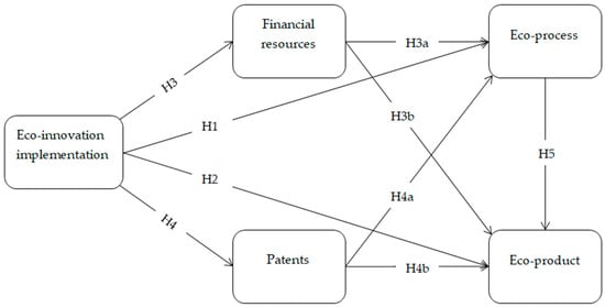 The conceptual framework, illustrated in Figure 1, depicts the relationships among the key variables in this study. It represents how the independent variable, eco-innovation implementation, affects the dependent variables, eco-processes and eco-products. The framework also includes the mediating role of financial resources and patents in shaping the impact of eco-innovation on the dependent variables. More specifically, it shows how eco-innovation implementation influences the availability of financial resources and the use of patents, which may in turn affect eco-processes and eco-products. Finally, the framework incorporates the connection between eco-processes and eco-products.