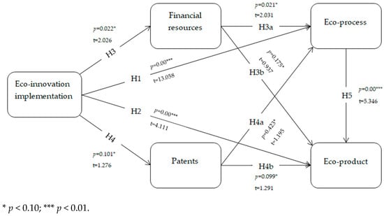 The following section presents a concise analysis of this study’s findings. Financial resources emerged as the only variable with low internal consistency, and all variables except financial resources showed convergent validity. Despite this, financial resources and all other variables displayed discriminant validity. The results obtained for financial resources should thus be interpreted with caution. It is also important to note that multicollinearity did not affect this model, as all variables except the second-order variable (eco-innovation implementation) were free of multicollinearity.