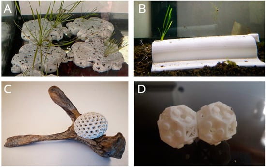 - BRANCH or BOULDER type: An ovoid object used to occupy the space between rocky blocks or submerged branches, equipped with a point of attachment to the bottom screw (or dowel) passing through. The geometric shape allows for the storage of large amounts of nutrient reserves and, therefore, ensures greater autonomy in environments with little organic soil available for engraftment (Figure 2C).