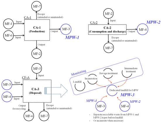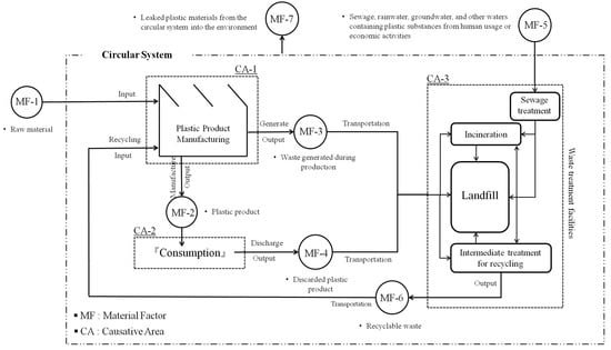 Factors influencing MPs within the circular system range from plastic product manufacturing to waste treatment facilities. (MF-1: raw material (raw plastic), MF-2: plastic product, MF-3: waste generated during production, MF-4: discarded plastic product, and MF-5: sewage, rainwater, groundwater, and other waters containing plastic substances from human usage or economic activities, MF-6: recyclable waste, MF-7: leaked plastic materials from the circular system into the environment; CA-1: manufacturing plastic products, CA-2: using plastic products, and CA-3: disposing of waste).