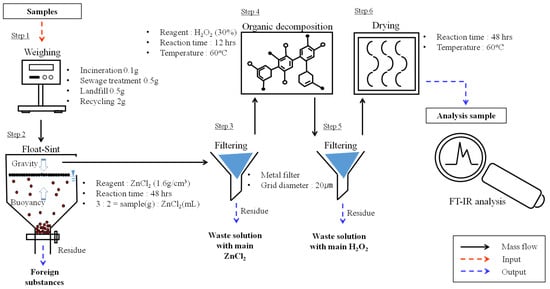 Prior to MP analysis, all samples were pretreated to separate foreign substances (nonplastic) and remove organic materials (Figure 2) [,,,,]. Samples weighing 0.1–2.0 g (Table S1) were subjected to a float–sink process using a separatory funnel to separate foreign substances. Given that typical plastics have a density of approximately 1.41 g/cm3 (Table S2), ZnCl2 was used as it has a density of 1.6 g/cm3 (Table S3). Following density separation, primary filtration was conducted using a 20 μm diameter metal filter (Table S4), and residual organic matter was removed using H2O2 solution (30%) (Table S5). Following acid treatment, samples were subjected to second filtration under the same conditions as the first filtration and subsequent drying. MPs were then analyzed via Fourier transform infrared spectroscopy (FT-IR; LUMOS II, Bruker, USA) (Figure S2) [,]. Analytical results were obtained through focal plane array mapping, and MP components were confirmed if the concordance rate with library data exceeded 70%.