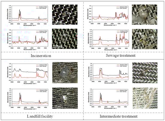 Table 2 shows the number of MPs (≤5 μm) in the samples from each facility. High levels of polypropylene, polyethylene, and polyethylene terephthalate were detected, along with polyvinyl chloride, polyamide, polyurethane, and polymethyl methacrylate. Fly ash (sample code: IBF) from municipal incinerators with a high plastic waste proportion presented with the highest MP levels, and process residues (sample codes: RF and RG) from facilities involved in intermediate treatment for recycling had higher levels compared with samples from other facilities. The average value for all samples was 333.5 ea/g. The FT-IR spectrum and image in Figure 3 support the results provided in Table 2.