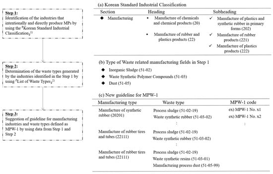 As a case study, the theoretical strategy associated with the MPW concept presented in Section 4 was applied to the Korean waste management system to confirm the feasibility of the MP management approach in a circular system. To apply MPW-1, a total of three separate steps can be implemented (Figure 5). First, the industries that intentionally and directly produce MPs are identified, including those with high waste plastic emissions and specific MP-generating processes (e.g., shredding, grinding, and cutting). To achieve this, the Korean Standard Industrial Classification, which categorizes and codes industrial activities for all companies in South Korea according to their nature and can be uniformly applied to compile various industry-related statistics, can be used []. Korean industrial sectors are categorized in the classification table as sections (21 types), divisions (77 types), groups (232 types), classes (495 types), and sub-classes (1196 types), with the industrial sectors generating MPW-1 also identified in this table. In the second step, the waste types generated by the industries identified in the first step are determined using the “List of Waste Types” stipulated in the Korean Wastes Control Act []. In the third step, data from the first and second steps are used to provide industry guidelines and determine waste types defined as MPW-1.