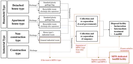 MPW-2 can be categorized into three waste product types: waste products containing MPs, those composed of MPs, and those with a potentially high incidence of MPs (the products categorized into each type are described in Section 3.1). Therefore, it is necessary to list the waste products for each of the three MPW-2 types and provide guidelines for separating them from other waste products during discharge []. Figure 6 presents the flow chart from waste discharge to treatment, illustrating the route for MPW-2-type waste separation and discharge to an MPW-dedicated landfill facility. If MPW-2 types are recyclable or more suited to incineration, they may be exempt from MPW-dedicated landfills.