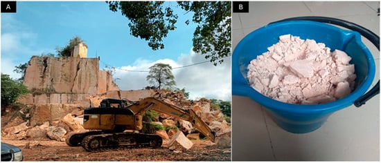 The active Gallo Crudo Quarry, operated by Granitos y Mármoles, extracts limestone and marble using traditional methods (Figure 1). In the Gallo Crudo Quarry, 900 m3 of marble are extracted annually, processing only 720 m3 of solid marble and generating 180 m3 of powdered waste that remains unused and without adequate disposal. This situation highlights the ornamental stone industry’s lack of sustainable waste management. The quarry uses diamond cutting wire, hammers, and hydraulic jacks to extract and cut stone blocks. Excess material is loaded with a loader into dump trucks with a 25 m3 capacity [9,24].