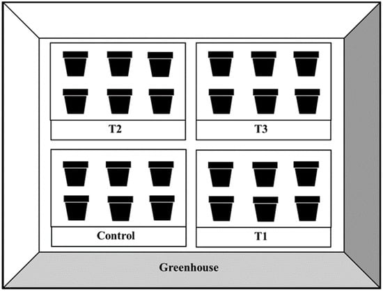 The mineralogical composition of the MD was determined using X-ray diffraction (XRD) analysis. A Philips X-ray Diffractometer X Pert MPD (Panalytical, Almelo, Netherlands) was operated at 40 kV and 40 mA. Mineral identification was performed using Match! software, version 3.16 Build 288 Crystal Impact, Bonn, Germany. After manual grinding, the chemical analyses of the MD and soil were carried out in triplicate. X-ray fluorescence (XRF) was used with a MagiX spectrometer (Panalytical, Almelo, the Netherlands) after the MD sample was digested by total melting. The Loss-on-Ignition (LOI) analysis at 1000 °C was performed in a muffle furnace Thermolyne FB1410M (Thermo Scientific, Waltham, MA, USA) with the gravimetric technique using a Pioneer Precision Balance 0.001/0.01 g with external calibration (Ohaus, Mexico City, Mexico). These analyses were conducted at the Agronomy Laboratory at the University of Passo Fundo, Brazil. Soil fertility was determined before applying treatments and after maize harvest. The parameter of pH in soil water (1:1) was determined with a pH Meter Basic AB315 Benchtop Laboratory pH/mV Meter equipped with a pH electrode Stand (Fisherbrand™, Madrid, Spain); organic carbon (%) by the Walkey Black method for titration by NTC 5403: 2013 [27]; available sulfur (mg kg−1) by extraction with monocalcium phosphate with a HI88703 table turbidity meter (Hanna Instrument, Limena, Italy); phosphorus (mg kg−1) by the Bray II method with an automated spectrophotometer, model SmartChem 200 Easy Block, Smart Digestor model Block Smart (Westco Scientific Instruments, Brookfield, USA); Ca, Mg, and exchangeable acidity (cmol kg−1) by the titration method with 1M potassium chloride solution; exchangeable potassium (cmol kg−1) with 1M ammonium acetate solution pH 7; and texture by dispersion with sodium hexametaphosphate. The Soil Analysis Laboratory of SENA’s El Porvenir Agricultural and Biotechnology Center conducted these analyses. Most tropical soils exhibit low fertility, being acidic with deficiencies in phosphorus and potassium [28]. The treatments were based on the experimental soil’s pH (4.72), the MD’s CaO concentration (90.27%), and regional fertilization practices [26]. Figure 3 shows the treatments applied: T0 (without MD) and three doses of MD (T1: 1.1 Mg of MD ha−1; T2: 2.2 Mg of MD ha−1; and T3: 3.3 Mg of MD ha−1), based on the standard recommendation for maize [26]. The experiment was carried out using a randomized block design with four treatments, each replicated three times. Each experimental unit consisted of two pots.