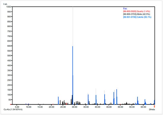 The XRD analysis (Figure 4) revealed the MD’s mineral composition, highlighting a predominance of calcite (CaCO3). This finding is typical of marble rock, which is formed mainly from the metamorphization of limestone [24,38].