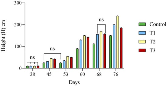 In this experiment, all three maize plants grown in each pot survived for the duration of the study. Figure 6 shows size responses regarding height (H) at 38, 45, 53, 60, 68, and 76 days after planting. During all evaluations, the highest heights were observed in treatment T2. Maize plants from all treatments that received doses of MD were significantly (p < 0.05) more prominent than those from the control treatment that did not receive fertilization. The height growth of plants was linearly related to age across all treatments (Figure 6 and Figure 7).