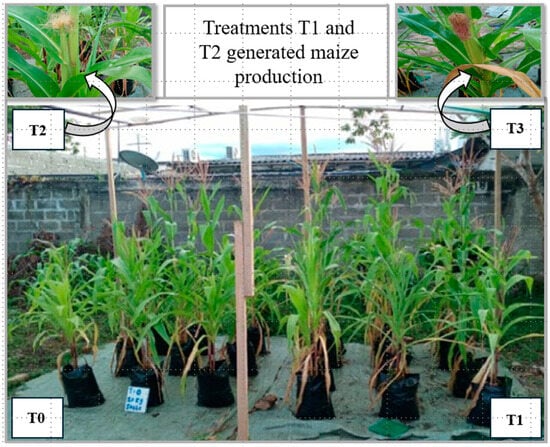 Treatments T2 and T3, located in the back of Figure 7, showed the development of ears in the corn plants, as seen in the zoom-in the upper left and right boxes, respectively. Tozsin et al. [54] obtained a similar result, stating that increases in hazelnut yield and efficiency due to pH neutralization due to MD applications were significant. These results demonstrated that the yield of hazelnut trees in untreated soil was 1120.3 kg ha−1 and gradually increased to 1605.5 kg ha−1 in soil treated with MD at a dose of twice the amount of lime required for agricultural application. Still, there were no significant differences between application rates. This indicates that applying MD in proportions equal to agricultural lime requirements could be sufficient for optimal performance.