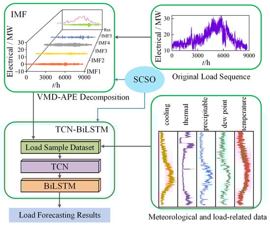 - The TCN-BiLSTM models are constructed for different types of loads and used to learn and train the sample sequences. Parameters’ optimization is achieved using the SCSO algorithm;