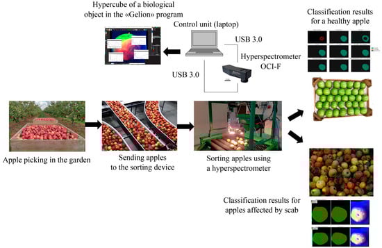 The infection of apple fruits by various fungal diseases and pests leads to large losses of harvested crop during storage. Hyperspectral diagnostic methods for fruit diseases and superficial skin damage are widely used for the preliminary assessment of the quality of fruit to be stored. Research by scientists has established that hyperspectral analysis is a promising direction and allows the studying of objects and materials on the basis of their spectral characteristics in a wide range of wavelengths. This provides information on the composition, structure, and physical and chemical properties of objects [,,].