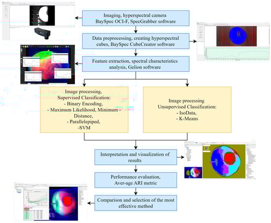 Thus, ARI was calculated for each region of interest using clustering performed by the K-Means and ISODATA algorithms, and comparison of the results with reference classes to obtain information on the similarity between clusters and classes was performed. Figure 2 shows the architecture diagram of the proposed approach.