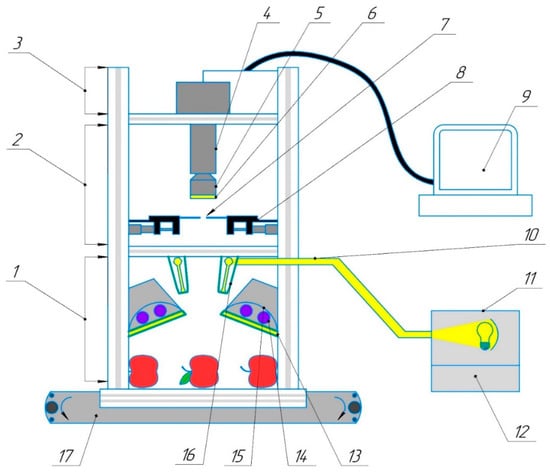 Design and technological scheme of optical system for identifying micro- and macrodamage to plant tissues. 1—sensor; 2—optics module; 3—sample illumination module; 4—conveyor belt; 5—short filter; 6—lens; 7—adjustable slit; 8—CCD matrix; 9—CCD matrix controller interface; 10—light-conducting flow; 11—light prism; 12—reflector; 13—matrix with backlight; 14—fluorescent lamp package; 15—long-pass light filter; 16—micrometer drive; 17—conveyor belt.