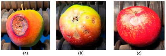The objects of the study were the fruits of the HoneyCrisp (Macoun = Honey gold), Gala (Kidd’s Orange × Golden Delicious), and Jonagold (Jonathan × Golden Delicious) apple varieties. The fruits were affected by scab, rot, and sunburn. Representative photographs of the fruits used in the experiments are shown in Figure 4. Sunburn on apples appeared as dark spots or layers of blackened, dry skin. Apples affected by apple scab have dark spots on the skin of the fruit and the texture of the spots is uneven or rough. Damage from apple rot is manifested in the form of rotting and the deterioration of the pulp of the fruit, dark spots, and superficial or internal rotten areas.