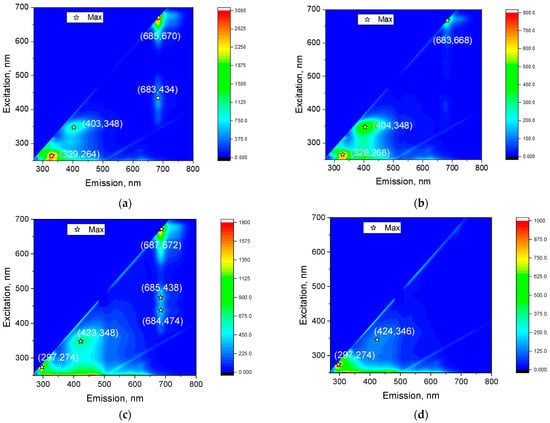 In parallel, the samples were identified using optical methods. The fluorescence spectra of healthy and damaged areas on the apple surfaces were studied (Figure 5). The following fluorescence intensity maxima were found in healthy apples: 2782 a.u. at λex = 264 nm, λem = 329 nm; 1024 a.u. at λex = 348 nm, λem = 403 nm; 540 a.u. at λex = 434 nm, λem = 683 nm; 3245 540 a.u. at λex = 670 nm, λem = 685 nm. The following fluorescence intensity maxima were found in apples affected by rot: 711 a.u. at λex = 266 nm, λem = 328 nm; 545 a.u. at λex = 348 nm, λem = 404 nm; 558 a.u. at λex = 668 nm, λem = 683 nm. The following fluorescence intensity maxima were found in apples affected by scab: 1527 a.u. at λex = 274 nm, λem = 297 nm; 644 a.u. at λex = 348 nm, λem = 423 nm; 405 a.u. at λex = 474 nm, λem = 684 nm; 420 a.u. at λex = 438 nm, λem = 685 nm; 1813 a.u. at λex = 672 nm, λem = 687 nm. The following fluorescence intensity maxima were found in apples affected by sunburn: 1006 a.u. at λex = 274 nm, λem = 297 nm; 154 a.u. at λex = 346 nm, λem = 424 nm. The characteristic dominant fluorescence at λex = 264 nm, λem = 329 nm, mediated by aromatic amino acids [], is observed only in healthy and rotten apples. In the case of apples affected by scan and sunburn, a shift in the dominant fluorescence intensity to a short wavelength region is observed. This is usually associated with oxidative damage to aromatic amino acids.