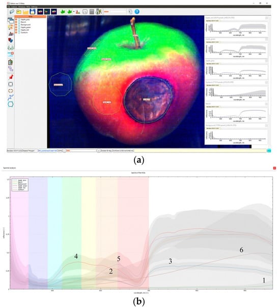 Hyperspectral imaging of a rotten apple. A general view of the marked-up image with the allocation of damaged areas’ ROI. (a). The spectra characteristics of different image types (b). 1—background, area to the left of the apple; 2—petiole area; 3—area along the apple contour, upper left edge of the apple; 4—area of the apple with red skin; 5—area of the apple with green skin; 6—area affected by rot, dark spot in the center.