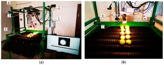 Bench for obtaining and processing hyperspectral images of apple fruit: (a) general view of bench; (b) working area; (1) bench frame; (2) stepper bipolar motors; (3) ball screw gear; (4) transmission; (5) table with rubber rollers; (6) suspension; (7) tungsten halogen lamps; (8) hyperspectrometer; (9) control unit.