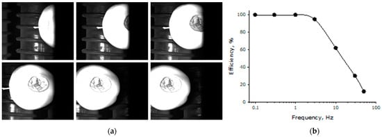 To answer the question about the maximum speeds at which the hyperspectral method for detecting apple damage can be used, the effect of the rotation speed of the rubber rollers of the table on the quality of hyperspectral imaging was studied. The quality of hyperspectral imaging was understood as the ratio of frames suitable for analysis to the total number of frames. Figure 8a shows examples of both suitable and unsuitable frames taken of the same apple at different rotation speeds of the rubber rollers. Figure 8b shows the dependence of the efficiency of hyperspectral imaging on the rotation frequency of the rubber rollers of the sorting line unit. It was found that the maximum efficiency of hyperspectral imaging is observed at rotation frequencies of up to 6 Hz. With an increase in the rotation frequency of the rubber rollers, the efficiency of hyperspectral imaging significantly decreases. In all subsequent experiments, a rotation frequency of the rubber rollers of 6 Hz was used.