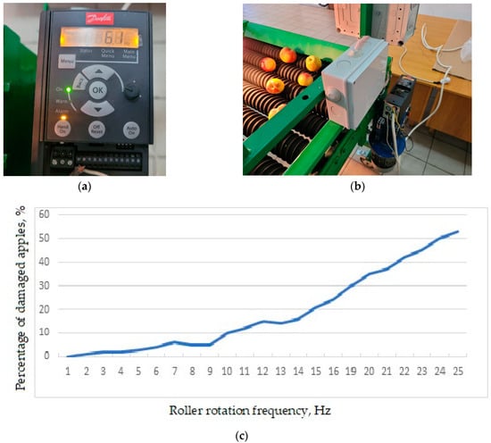 The dependence of the rotation frequency of the rollers of the automated device for obtaining images and sorting from damage to apples. (a). Photography of the controls of the device. (b). Photography illustrating the placement of controls on the device. (c). Dependence of the degree of damage to fruits on the rotation speed of the rollers of the device.
