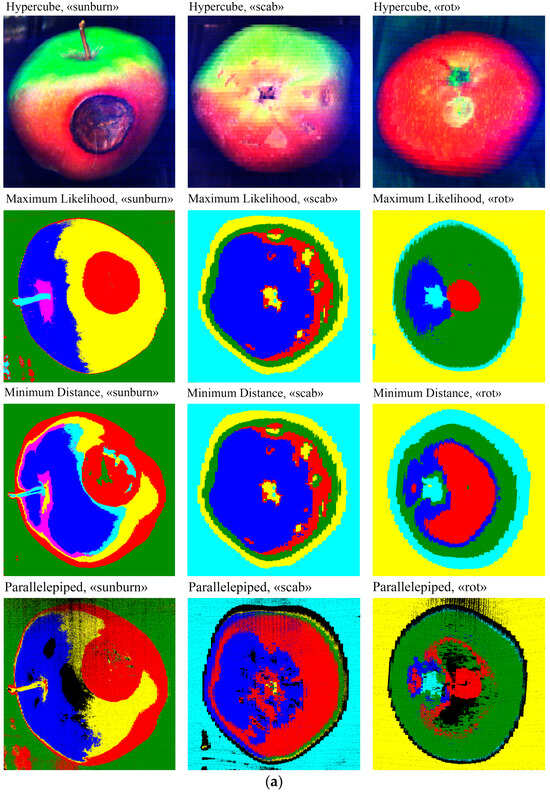 The authors [] applied a non-destructive approach to apple variety classification using a multi-channel hyperspectral imaging system incorporating illumination. Partial least squares discriminant analysis (PLS DA) models were developed for individual SR (spectral resolution) spectra and their combinations to evaluate their performance in variety classification. Results showed varying accuracy in classifying apple cultivars using single-SR spectra, with optimal SR spectra differing between spectral types. Using the method of binarisation and segmentation of hyperspectral images, it is possible to identify areas of apple fruit damage (to identify damaged skin) and images of objects having certain characteristics at certain wavelengths. These methods have been used to determine fruit quality, for example, to identify apples with damaged peel or signs of disease [].