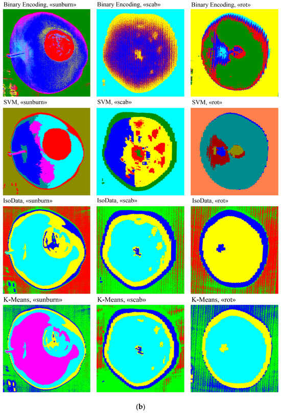 Results of recognition and classification of hyperspectral cube images of apple fruit using supervised classification and unsupervised classification methods: (a) Hypercube, Maximum Likelihood, Minimum Distance, Parallelepiped; (b) Binary Encoding, SVM, IsoData, K-Means.