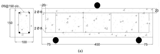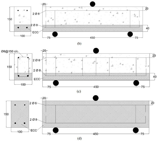 Four beam specimens with rectangular cross-sections were tested in the university’s laboratory. The specimens were a regular RC beam with stirrups (designated RC-St and shown in Figure 1a), an RC beam with an ECC layer (designated RC-ECC and shown in Figure 1b) but without stirrups, an RC-ECC beam with stirrups (designated RC-ECC-St and shown Figure 1c), and a reinforced ECC beam without stirrups (designated ECC and shown Figure 1d). All beams have a clear span of 450 mm, a width of 100 mm, and an effective depth of 130 mm. The bottom flexural reinforcement of all the beams is two 8 mm bars, and the top reinforcement is two 6 mm bars. The stirrups are 6 mm bars with a spacing of 150 center-to-center. The ECC layer of the RC-ECC beams covered the bottom reinforcement to a depth of 40 mm from the bottom of the beam. Figure 1 shows detailed drawings of all test specimens with the support and loading conditions.