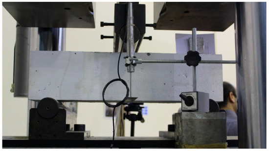 The beam specimens were tested under a simply supported three-point flexure test by applying a point load using a DARTEC hydraulic actuator with a 1500 kN loading capacity. The beams had a clear span and shear span of 450 mm and 225 mm, respectively. The testing mode was displacement-controlled with a 0.01 mm/sec loading rate. A linear voltage displacement transducer (LVDT) was placed at the midpoint of the clear span of the specimen to measure the mid-span deflection. Figure 2 shows the test setup and the position of the LVDT. All test specimens were painted white to monitor the crack development and propagation during the tests. A crack-width ruler and crack-width microscope were used to measure cracks while the specimen was under loading.