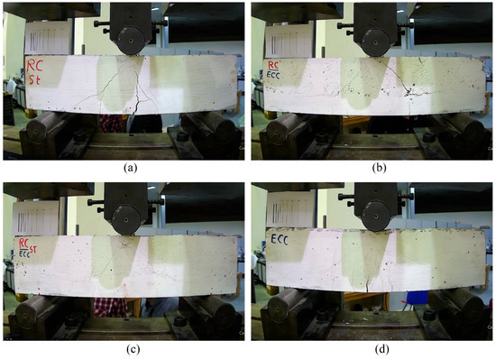 Beam specimens after testing: (a) RC-St; (b) RC-ECC; (c) RC-ECC-St; (d) ECC.