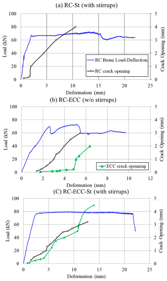 Moreover, comparing the load–deflection curves of beams RC-ECC-St and ECC (Figure 4c,d) shows that they behaved similarly, especially in terms of the overall behavior, displacement ductility, and cracking pattern. Both specimens did not fail due to shear even though the ECC beam had no stirrups. Therefore, it is safe to say that in this investigation, the use of ECC reduces or eliminates the need for shear stirrups due to the microfiber’s function in bridging any possible shear cracks.