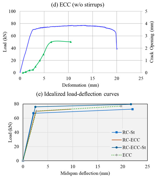 Load–deflection and crack openings: (a) RC; (b) RC-ECC; (c) RC-ECC-St; (d) ECC; (e) idealized load–deflection curves.