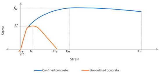 Stress–strain relationship of confined and unconfined concrete (compression side only).