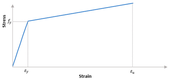 The adopted reinforcing steel model is a bilinear elastoplastic model with strain hardening. This model was used for compression and tension and consisted of a linear elastic range and linear kinematic hardening range, as shown in Figure 6. Equations (14)–(16) are the defining model parameters. The first equation is for the elastic range and is valued for all stresses less than or equal to the yield stress . The second equation is for the plastic range at which the stresses are higher than .