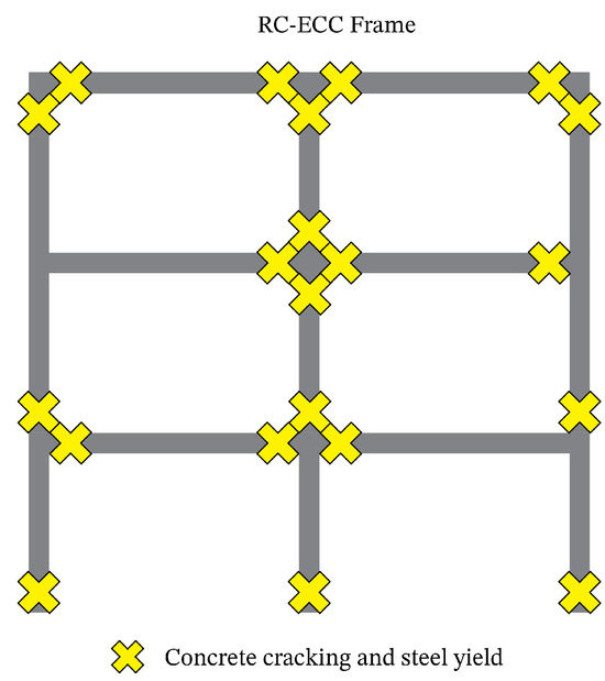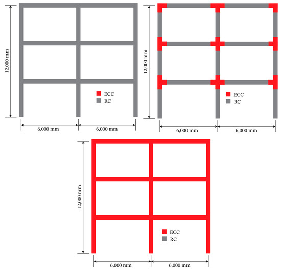 In this section, the performances of a full RC frame, an RC frame with ECC at the beam–column joints, and a full ECC frame are investigated, and their performances are compared against each other. This investigation used two types of analyses: modal analysis and nonlinear quasi-static cyclic analysis. All analyses were run using Zeus-NL [42], which comprised a dedicated ECC material constitutive model for ECC [43,44].