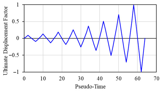The same frames were analyzed using Zeus-NL when subjected to a cyclic load applied on the roof. The cyclic load protocol is based on FEMA 461 [51], which depends on the maximum displacement () obtained from pushover analysis. The loading protocol started from a displacement value of 0.048 and increased by 140% each cycle. For clarity purposes, only a subset of the loading protocol is shown in Figure 9.