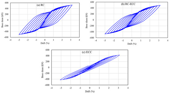 As shown in Figure 12, the RC-ECC frame exhibited a hysteresis behavior similar to that of the RC frame. Nevertheless, the damage was limited to the steel yielding due to the ECC contribution to the beam–column joints. However, the initial stiffness was slightly less than that of the RC frame (Figure 10b), but the effective stiffness was approximately the same at 167 kN/mm. The energy dissipation through hysteresis is less than that in the RC frame, which indicates the low level of damage sustained by the RC-ECC frame (Figure 10b).