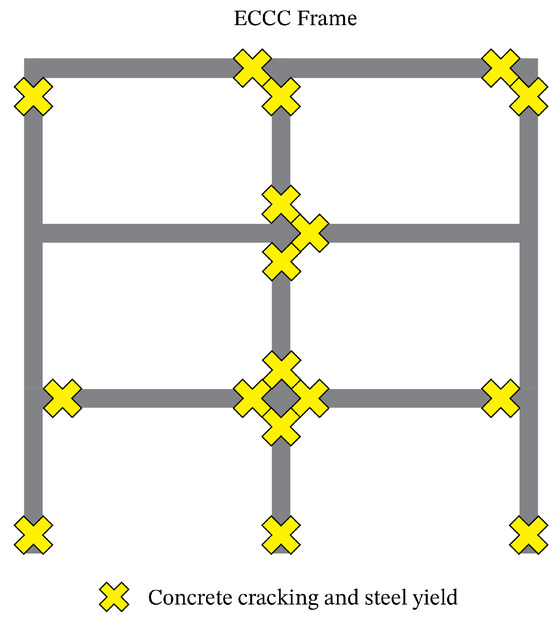 Similar to the RC frame with ECC replacing the joints, the full ECC frame exhibited concrete cracking and steel yielding (Figure 13). However, as shown in Figure 10c, the narrow load–displacement hysteresis response loops indicate that the contribution of microfibers in the ECC mix has reduced the damage to the structural members. The full ECC frame had the lowest initial stiffness, and its effective stiffness and base shear were 20% less than those of the two previously discussed frames. The frame’s slight inelastic deformation started at approximately 1% drift (@220 kN), mainly due to the multitracking of concrete members and the partial yielding of the reinforcing steel.