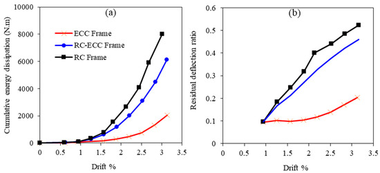 The ECC frame dissipated the lowest energy through hysteresis (Figure 14a). The microfibers distributed the stress uniformly across the structural members, thus preventing the formation of plastic hinges and soft stories. The ECC frame had a 74.5% lower energy dissipation than that of the RC frame and 66.6% lower energy dissipation than that of the RC–ECC frame. Most of the energy dissipated by the ECC frame was in the form of viscous damping; therefore, the residual deflection ratio was practically constant (Figure 14b).