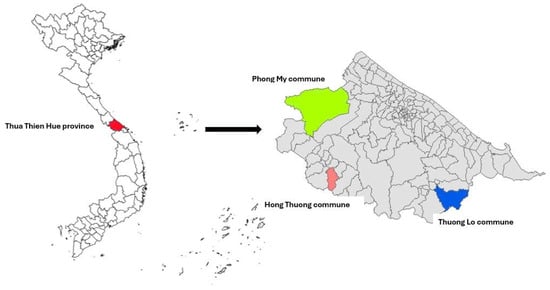 This study was conducted in three upland communes, including Phong My, Thuong Lo, and Hong Thuong, which are located in the Phong Dien, Nam Dong, and A Luoi districts, respectively (Figure 1). The selection of these three communes was based on different reasons. Firstly, there are recent studies [,] showing that CC has affected livelihood activities and natural resources. Secondly, the local communities consist of different ethnic minority groups who depend on forest resources for their livelihoods and thus potentially exhibit different EbA strategies. Thirdly, the benefits from ecosystem services are closely correlated with the communities’ resilience.
