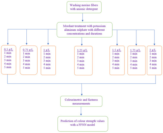 Merino wool fiber was colored with the natural dye obtained from Aesculus hippocastanum shell using a microwave oven (Whirlpool-jet Stream) at 90 watts and a 1:50 liquor ratio for 2,4,6, 8, and 10 min. After the dyeing process, the specimens were left in the dye bath for 12 h. They were treated with a cold rinse overflow, followed by soaping with 1 g/L anionic detergent (Denraw NBP, Denge Chemical Incorporated Company, Tekirdağ, Türkiye) at a 1:50 liquor ratio at 70 °C for 10 min, followed by a final cold rinse. The study’s experimental process is illustrated in Figure 2.