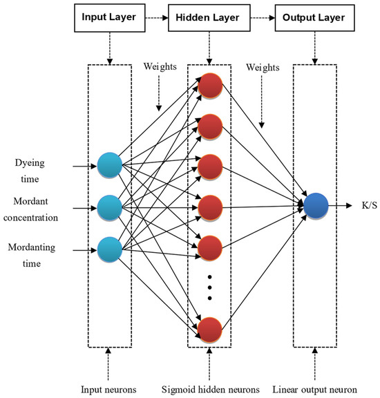 In this study, an FFNN model with sigmoid hidden neurons and a linear output neuron was utilized to forecast the K/S dyeing property of merino wool fibers. Figure 3 depicts the proposed FFNN model, which comprises input, hidden, and output layers. In the model, the dyeing time, mordant concentration, and mordanting time are the inputs, and the K/S dyeing property is the output. The number of neurons in the hidden layer was set to 10, as in various previous studies [29,30,31,32]. The network is optimized through the hidden layer, and the number of neurons in this layer depends on the nature of the problem [31,32,33,34]. In other words, for different estimation problems, the number of neurons varies according to the input variables and output variables in the dataset. In FFNNs, the output layer displays the network’s outputs and measured values, while the input layer takes data from the outside and feeds it into the network. Each input and output layer has the same number of neurons as there are input and output characteristics, respectively [31,32,35].