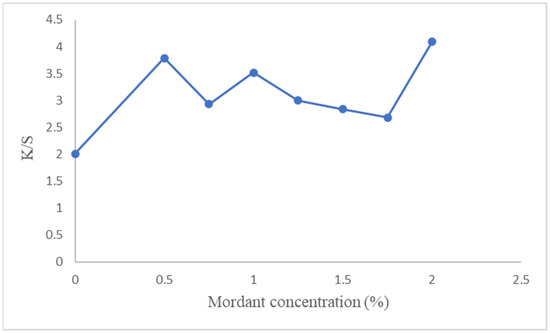 The color strength value of the samples dyed for 2 min after being mordanted for 4 min was examined to determine the effect of mordant concentration on the color strength of the dyeing. The color strength of the samples is given in Figure 4.