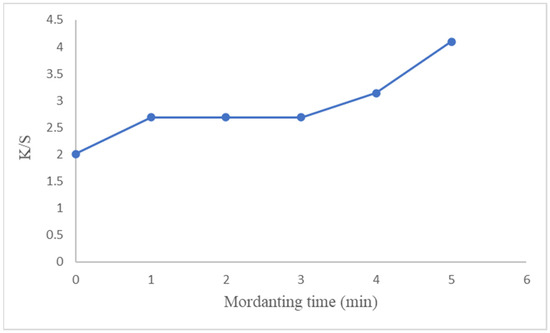 The color strength value of the samples dyed for 2 min after mordanting with 1.75 g/L aluminum potassium sulfate salt was examined to determine the effect of mordanting duration on the color strength of the dye. The color strength of the samples is shown in Figure 5.