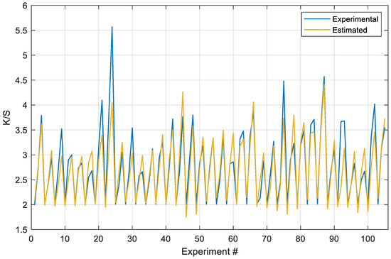 The proposed FFNN model was performed in MATLAB R2020b. In the model, the input dataset is symbolized by a 105 × 3 matrix—105 samples of three elements—while the output dataset is represented by a 105 × 1 matrix for the K/S dyeing property output—105 samples of one element. Training (70%, 73 samples), validation (15%, 16 samples), and testing (15%, 16 samples) were the three subsets generated by randomly splitting the input dataset into these three categories. The experiments were repeated many times, and the success of the proposed model was observed for different subsets. Thus, it was found that the model achieves close and successful results for different subsets, and the replicability of the model is guaranteed. The neural network was educated utilizing specimens from the training subset during the training process, and the network was then arranged based on its error. The generalization of the network was evaluated using samples from the validation subset, and the training process was stopped when further improvements were no longer observed. Consequently, the samples from the testing subset procure a separate measure of the network’s performance both during and after training. The regression results of the suggested model are given in Table 3 in terms of training, validation, testing, and all subsets. The correlation between estimated outputs and actual targets is specified using regression values. A regression value of zero denotes a random relationship, whereas a regression value of one denotes a close relationship. By selecting 10 neurons in the hidden layer, the regression value of 0.90355 for the entire dataset was achieved for the K/S dyeing property, as shown in Table 3. Additionally, the regression results for training, validation, and testing subsets were 0.93955, 0.91319, and 0.87557, respectively. Figure 7 depicts the experimental and estimated values for the K/S dyeing property. This graph illustrates that the experimental and estimated results are relatively similar to one another or equal in the majority of tests. The FFNN-based results all reveal that the proposed model can accurately predict the K/S dyeing property of samples.