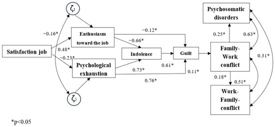 This study analyzed job satisfaction and its relationship with burnout and its consequences. According to the studies reviewed, the following hypotheses are proposed using a structural model of airline cabin crew members: (H1) job satisfaction is positively related to enthusiasm toward the job and (H2) negatively related to psychological exhaustion; (H3) enthusiasm toward the job is negatively related to indolence and (H4) negatively related to guilt; (H5) psychological exhaustion is positively related to indolence and (H6) positively related to guilt; (H7) indolence is positively related to guilt; (H8) guilt is positively related to family–work conflict; and (H9) family–work conflict is positively related to work–family conflict and (H10) positively related to psychosomatic disorders.