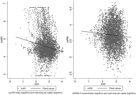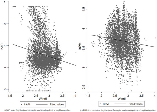 The level of road traffic infrastructure in all cities outside the focal city is weighted using a spatial weight matrix to form the spatial lag term of road traffic infrastructure [29], representing the level of road traffic infrastructure in neighboring cities. Figure 2 illustrates the correlation between air pollution and the road traffic infrastructure of neighboring cities. It is evident that a negative correlation exists between the two, indicating that improvements in road traffic infrastructure in neighboring cities may contribute to a reduction in local air pollution. This suggests the potential existence of spatial spillover effects from road traffic infrastructure.